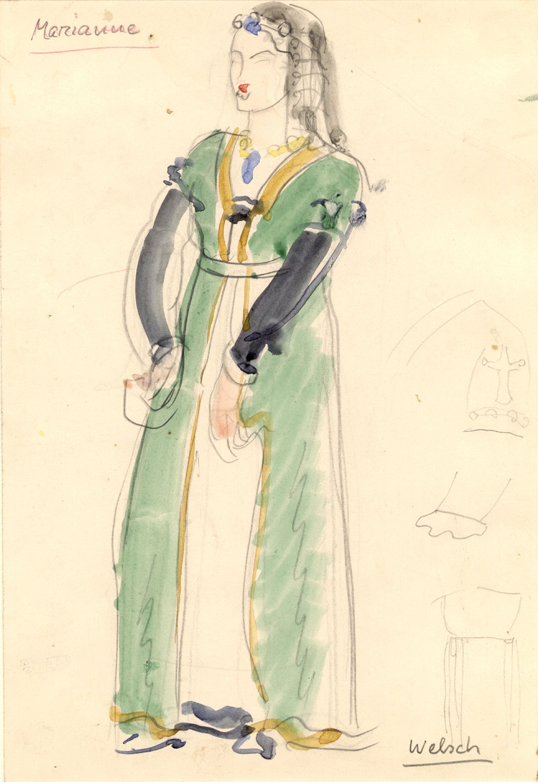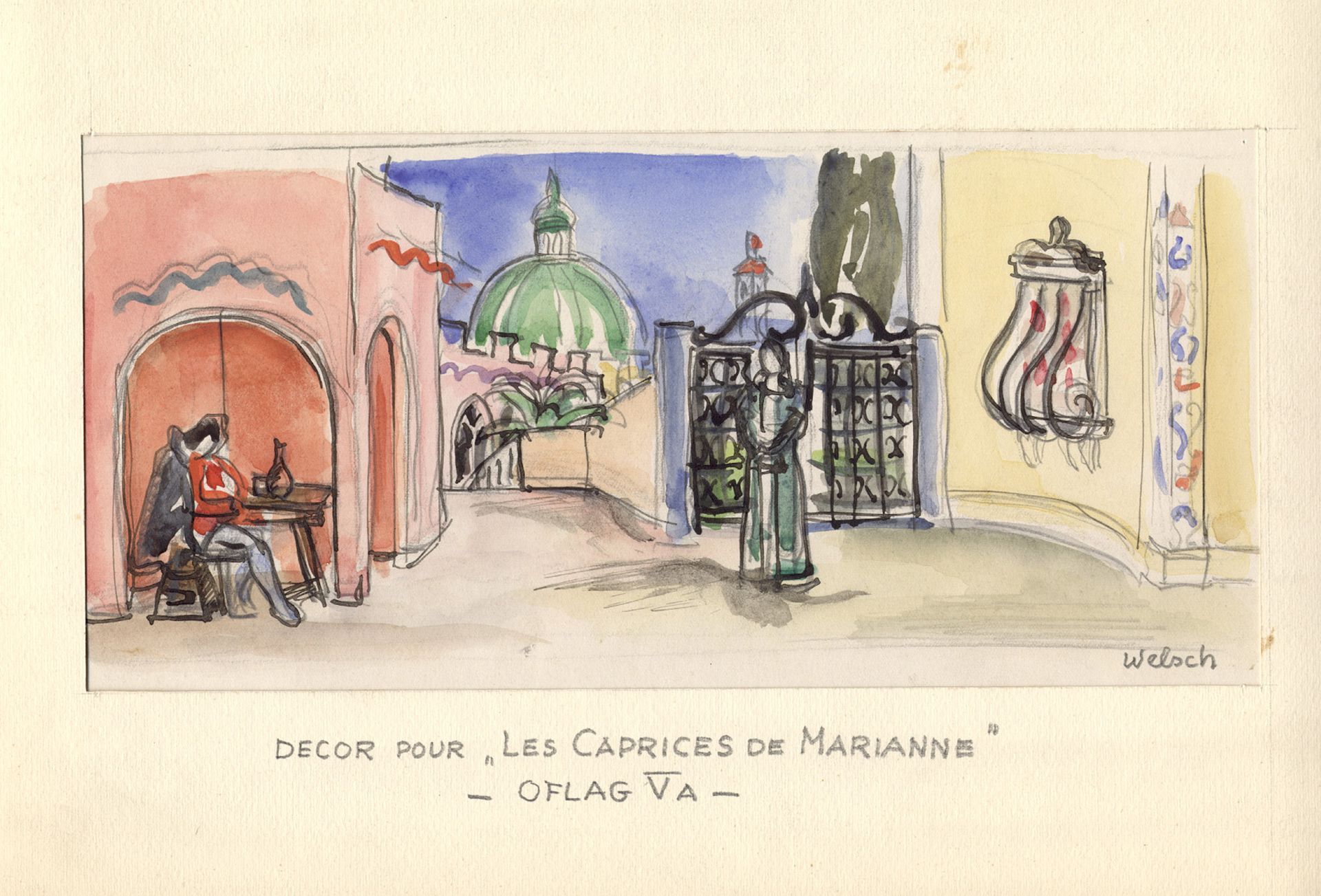 In autumn 1941 he was transferred to V.a oflag in Weinsberg. He devoted his time there to drawing the costumes, the sets, the programmes of the drama group formed by the prisoners: Les Caprices de Marianne by Musset, Les 30 millions de Gladiator by Labiche. Released as a French veteran of the old classes, he passed through Stuttgart before being able to reach Paris. He stays most of the rest of the war in the Dordogne, in Génis, in Périgord Vert.