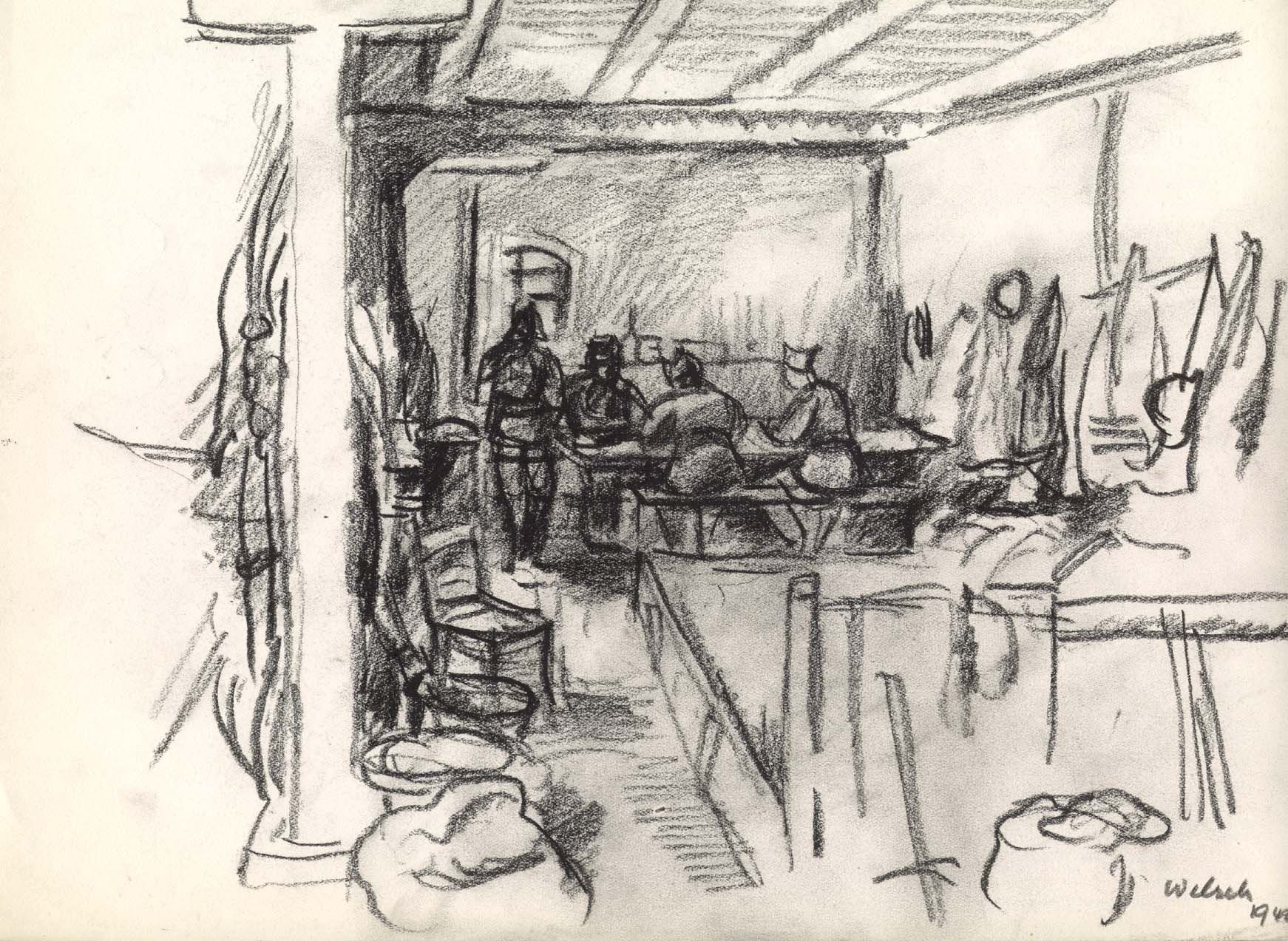 He was taken prisoner at the armistice near Saint-Dié: first encampment at Sélestat, then captivity for five days at the Hirth barracks in Strasbourg. From there he was sent to Mainz and then north of Vienna in Austria in Oflag XVII. He produced a series of drawings inspired from these various stays which he signed "Velche" to erase any Germanic hints in his name. When he exhibited them in Paris at the Grand Palais in August 1944 then, at the end of 1946, at the Salon des Artistes Libérés, he signed the works that were no signed by his real surname.